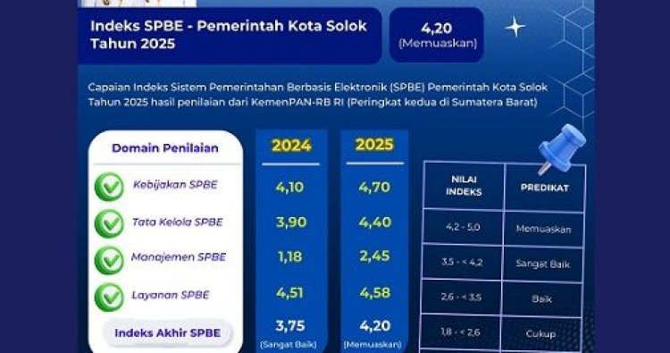 SOLOK KOTA – Komitmen Pemerintah Kota Solok dalam membangun pemerintahan digital kembali membuahkan hasil membanggakan. Berdasarkan hasil penilaian Indeks Sistem Pemerintahan Berbasis Elektronik (SPBE) Tahun 2025, Kota Solok berhasil meraih nilai 4, 20 dengan predikat “Memuaskan”, sekaligus menempatkan daerah ini sebagai salah satu pemerintah daerah dengan kinerja digital terbaik di Provinsi Sumatera Barat.